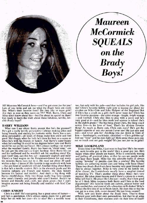 Every time I see Mike, I just want to hug him! He's the sweetest, most lovable guy in the world! He's a good guy too. He's happy when other people are happy. Mike is constantly teasing and pulling off practical jokes, so that he can see people smile and hear them laugh. Mike has this adorable habit of always saying "howdee" to people-just like a cowboy! His favorite hobbies are collecting model cars and being with Susie Olsen! These two Brady Bunch-ers have become very good friends and they're always together. Mike is very close to his family too. After dinner, the Lookinlands usually have a songfest instead of watching TV. That's another thing about Mike-he's very musical. He takes piano lessons and if there's a piano in a room, Mike will find it. He plays like Liberace-really, that's how good he is! I think Mike surpasses both Barry and Chris in the food department!! His favorite foods are carrots, peanut butter and jelly sandwiches, and most of all-chocolate milk shakes! Mike's always the first one of us to finish lunch. He does this so that he can get to a nice, rich, sweet dessert! He just loves sweets!! Well, now you know about the Brady boys. They're three different guys with their own personalities, but they're all alike in their friendliness, their niceness and-in their love of food!!