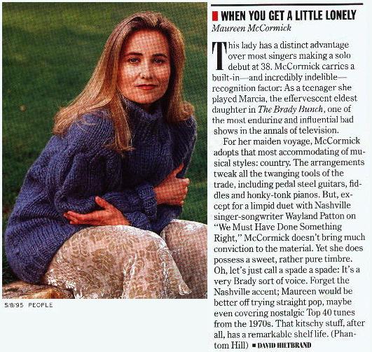 This lady has a distinct advantage over most singers making a solo debt at 38. McCormick carries a built-in-and incredibly indelible-recognition factor: As a teenager she played Marcia, the effervescent eldest daughter in The Brady Bunch, one of the most enduring and influential bad shows in the annals of television.